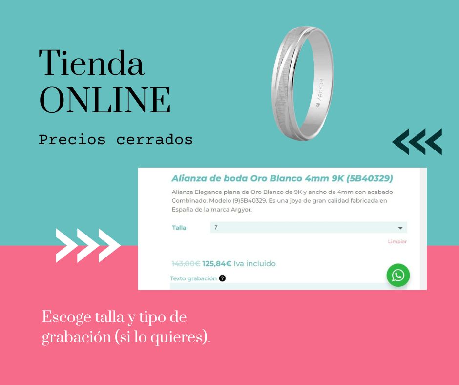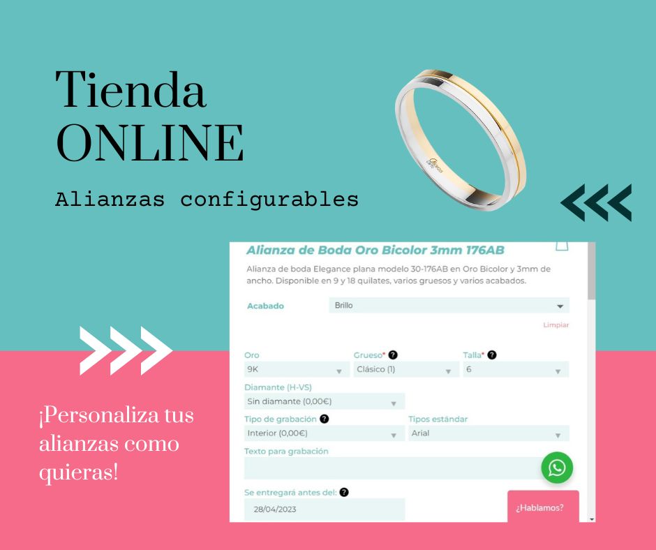 En Oro Alianzas sabemos que no siempre tenemos tiempo para ir presencialmente a los sitios y que otras veces, eso que nos gusta, no nos queda al lado. En nuestra Web tenemos un amplio catálogo de alianzas y anillos de compromiso, de todo tipo, de todos los modelos, para todos los gustos y a los que también podéis tener acceso aunque no estéis cerca de nosotros (y por mucho que eso nos apene). Nuestra Web dispone de tienda online tanto para anillos de compromiso como para alianzas de boda. Además, tendremos contacto directo a través de nuestro WhatsApp (644 442 553), disponibles, siempre, para solucionar cualquier duda y/o ayudaros en esa compra online, además de responder vuestras preguntas e intentar orientaros y asesoraros en la compra de vuestras alianzas de boda y anillos de compromiso.