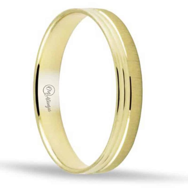 Alianza en oro Amarillo 18k plana satinada con doble lรญnea lateral en brillo y 3.5 de ancho e interior confort.