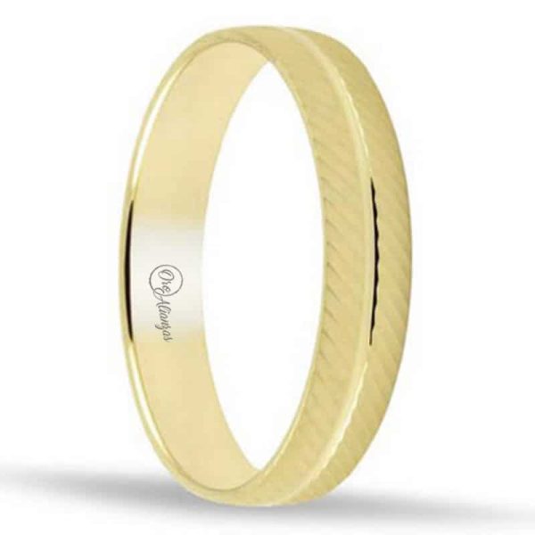Alianza en oro Amarillo 18k media caรฑa estriado diagonal, con canal central en brillo y 4 de ancho e interior plano.