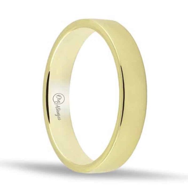 Alianza en oro Amarillo 18k plana y 4 de ancho e interior confort. Disponible en los siguientes acabados : Brillo, Diamantado, Satinado, Satinado lateral.