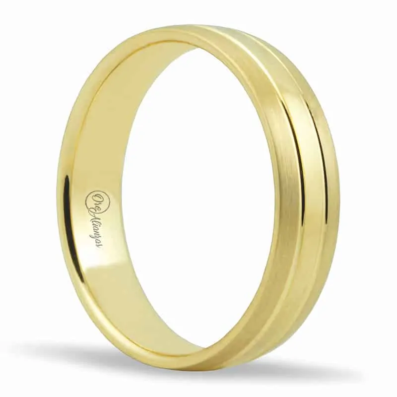 Alianza en oro Amarillo 18k media caรฑa con banda central en brillo, bandas laterales satinadas y 5 de ancho e interior confort.