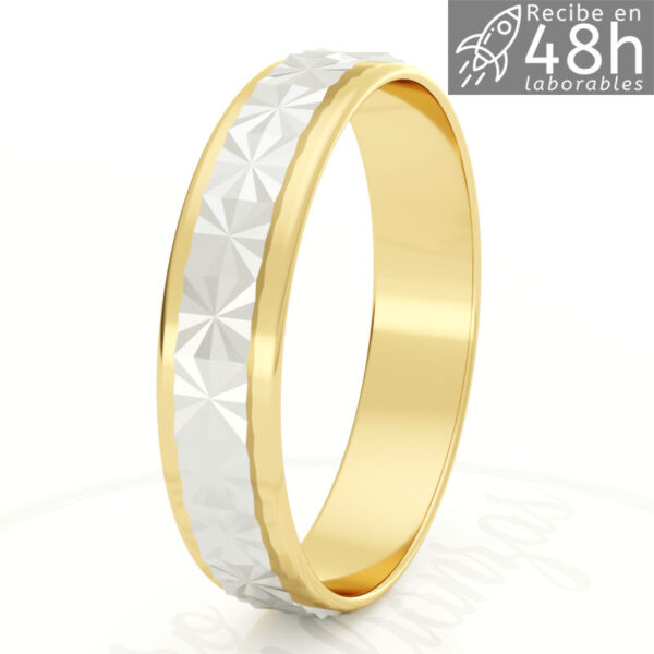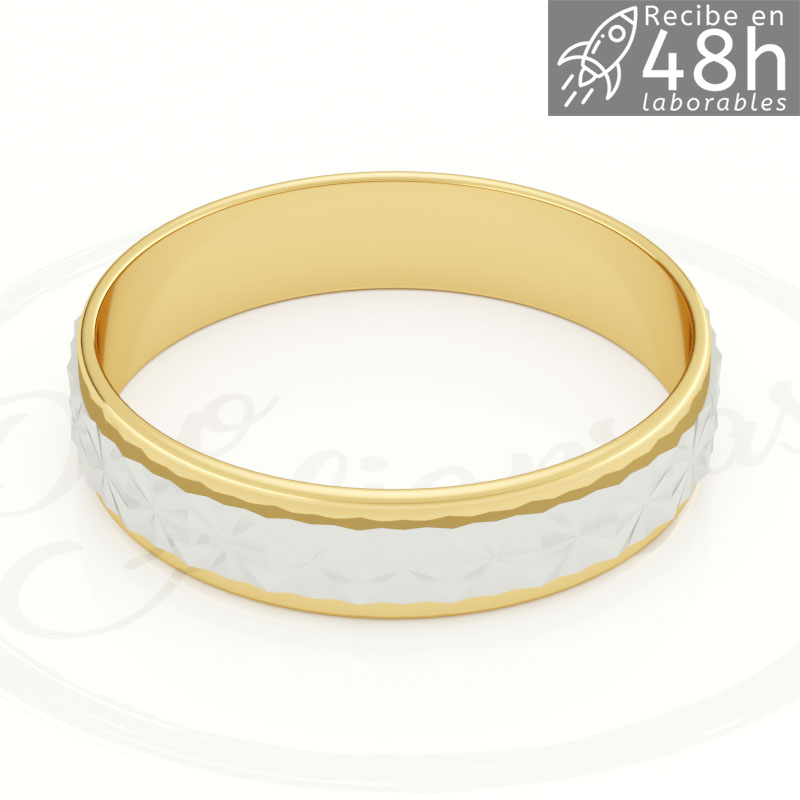 Alianza en oro Bicolor 9K y 18K laterales en brillo, canal central facetado brillo y 4 mm de ancho e interior plano.