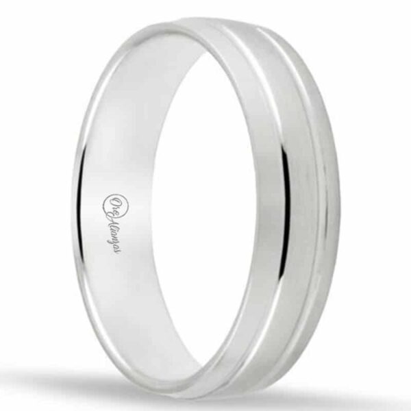 Alianza en oro Blanco 18k media caรฑa con banda central en brillo, bandas laterales satinadas y 5 de ancho e interior confort.